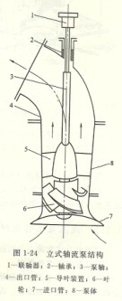 軸流泵的種類根據(jù)泵軸安裝位置可分為立式(圖1—24)、斜式和臥式三種。它們之間僅泵體形式不同,內(nèi)部結(jié)構(gòu)基本相同。